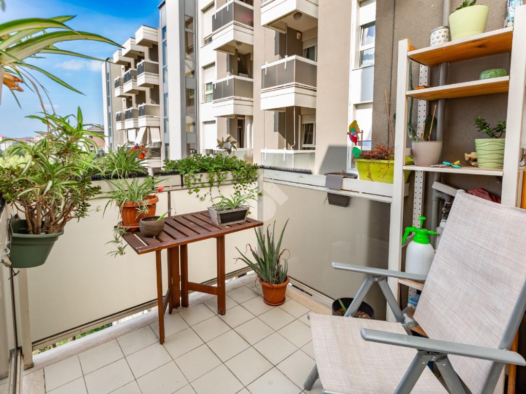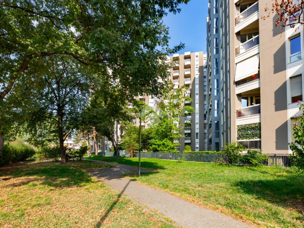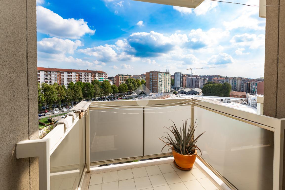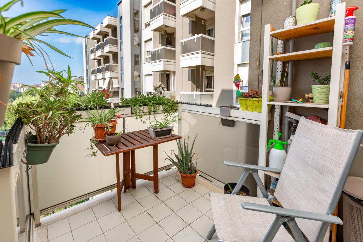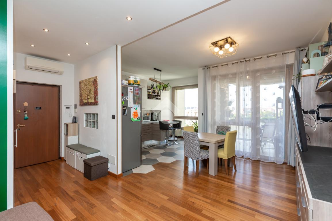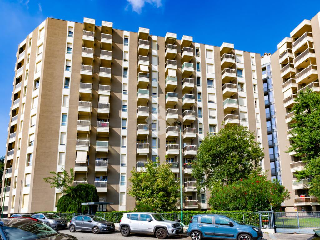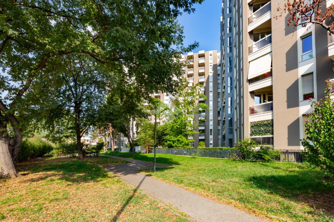 La scala dove si trova l’appartamento è dotata del doppio ascensore. L’immobile è sito all’ottavo piano ed internamente è stato ristrutturato circa cinque anni fa. Dal portoncino blindato accediamo direttamente sulla zona giorno composta dal soggiorno living con angolo cottura. La pavimentazione è in parquet, tranne per la zona cucina dove troviamo una piastrella esagonale con diverse tonalità di grigio. L’ambiente è munito di un climatizzatore ed ha una metratura di circa 35 mq che ci permettono di godere al meglio ogni singolo spazio e i momenti di relax in famiglia, ed ha l’affaccio sul cortile comune tramite un ampio balcone. Grazie al disimpegno, il quale divide le due zone, si accede alla zona notte dove troviamo le due camere, entrambe con parquet, quella matrimoniale con finestra e la seconda camera munita di balcone. Il bagno è diviso in due zone, dove nella prima troviamo il lavandino ed il box doccia, e al fondo i sanitari e l’angolo lavanderia ( lavatrice/asciugatrice ). Tutti gli infissi esterni sono in pvc con doppio vetro, muniti di zanzariere e tapparelle elettriche. Il sistema di riscaldamento nel condominio è il teleriscaldamento. Completa la proprietà un locale ad uso cantina sito al secondo piano interrato.