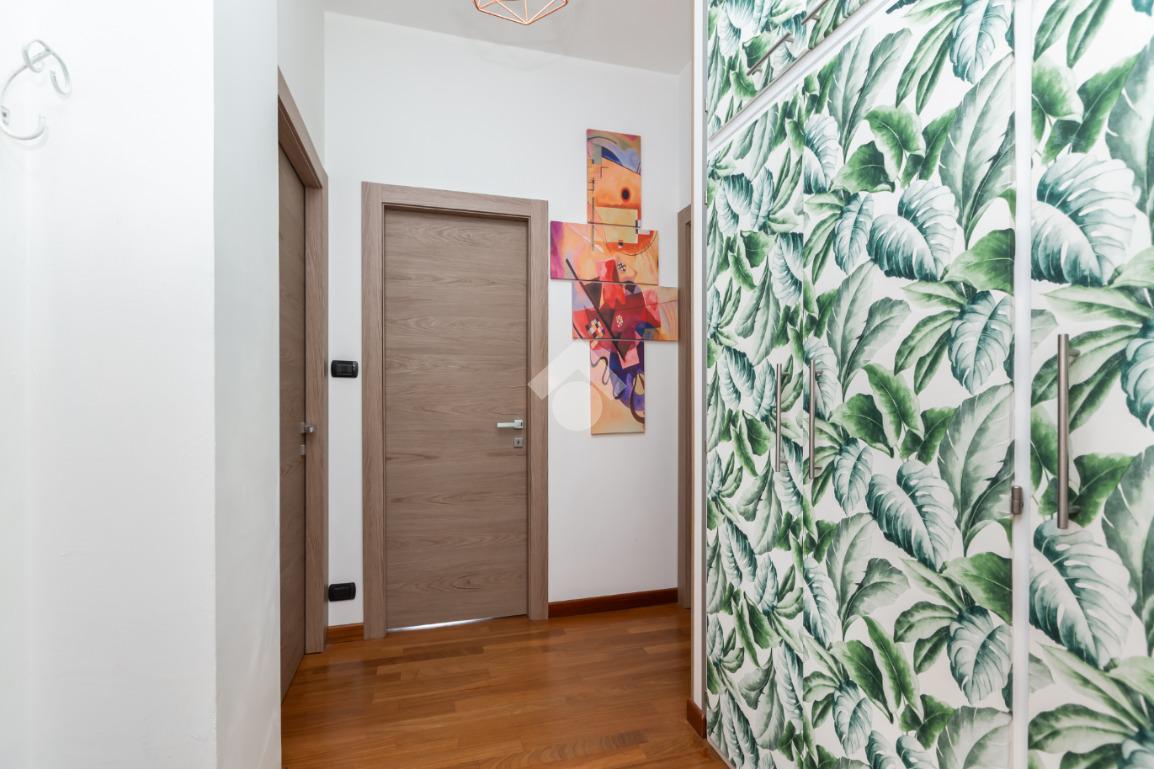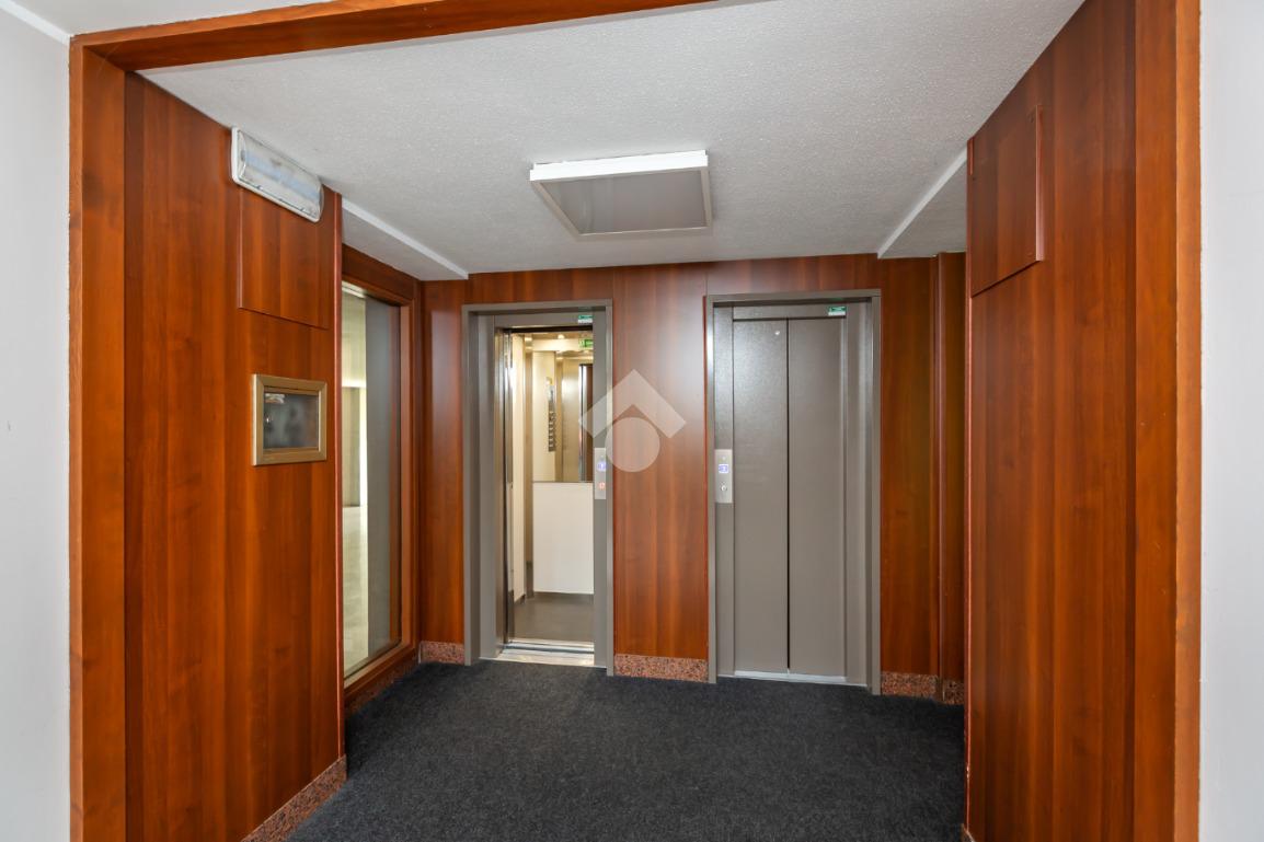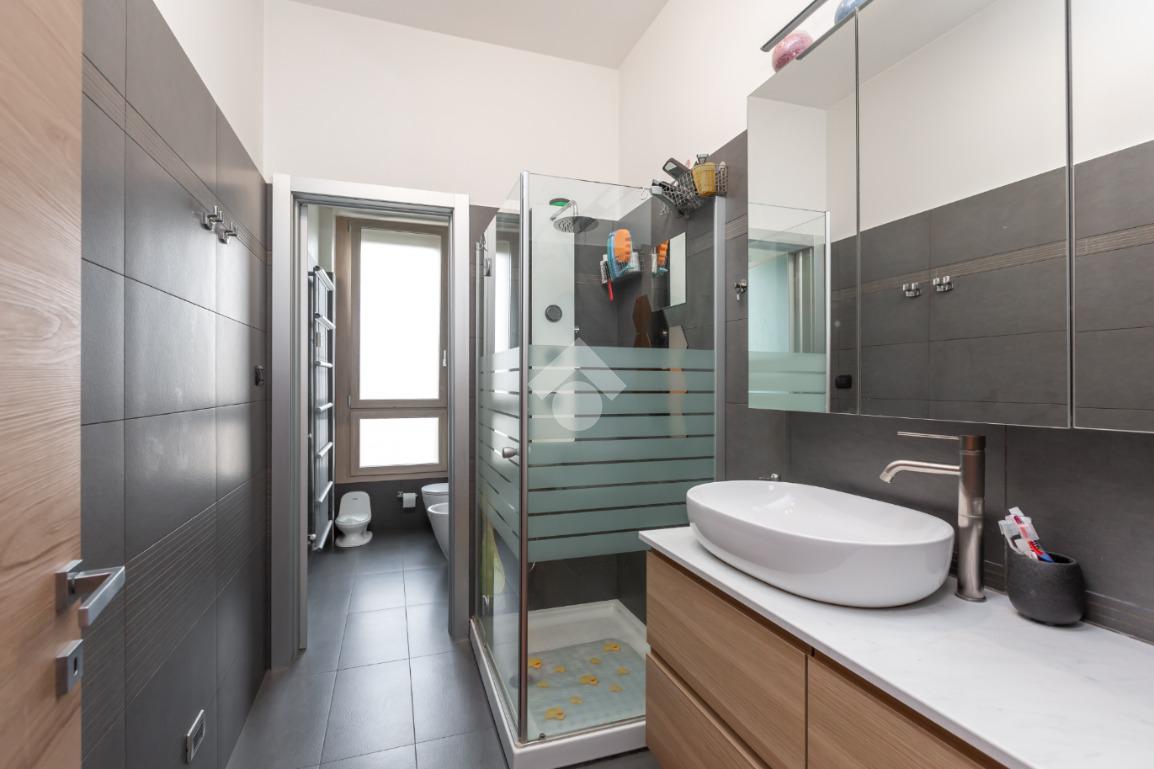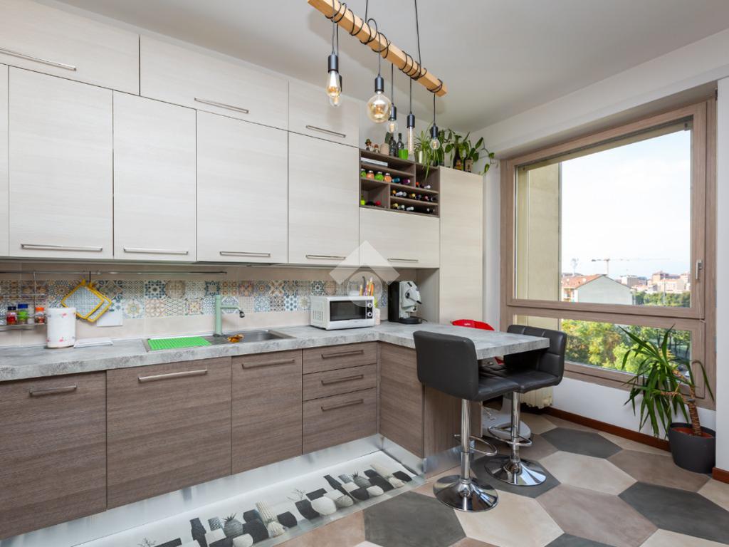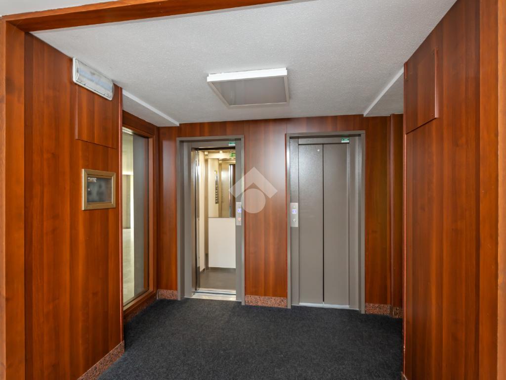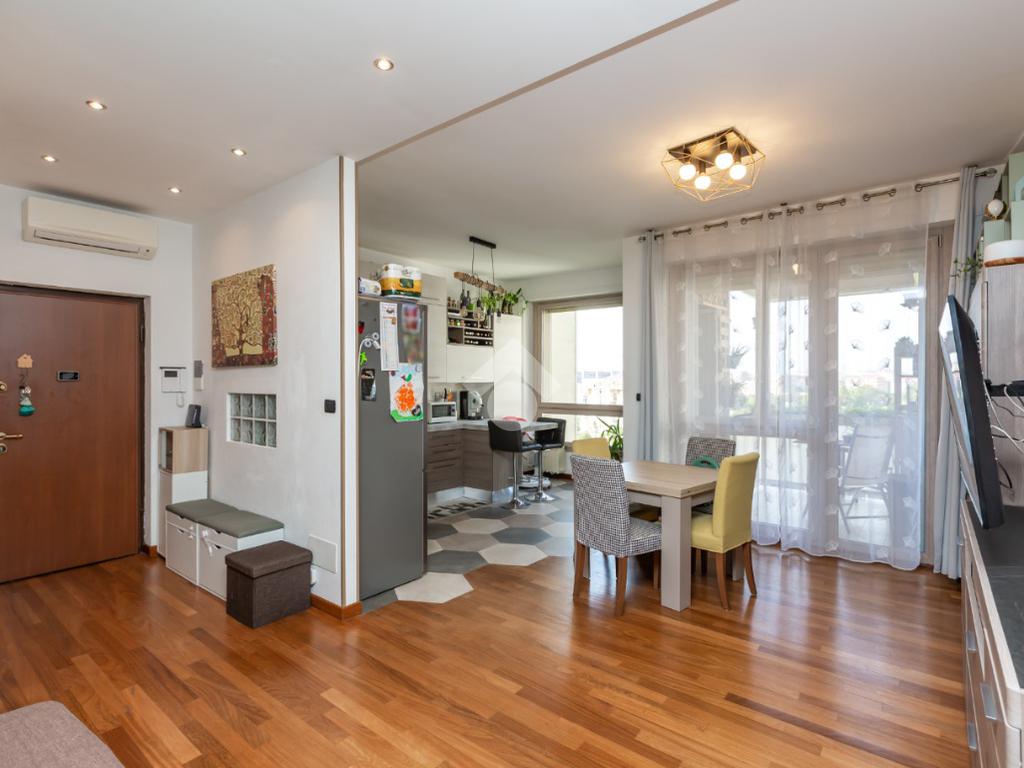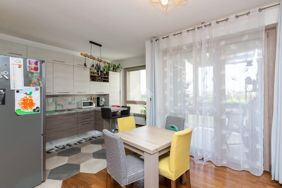 La scala dove si trova l’appartamento è dotata del doppio ascensore. L’immobile è sito all’ottavo piano ed internamente è stato ristrutturato circa cinque anni fa. Dal portoncino blindato accediamo direttamente sulla zona giorno composta dal soggiorno living con angolo cottura. La pavimentazione è in parquet, tranne per la zona cucina dove troviamo una piastrella esagonale con diverse tonalità di grigio. L’ambiente è munito di un climatizzatore ed ha una metratura di circa 35 mq che ci permettono di godere al meglio ogni singolo spazio e i momenti di relax in famiglia, ed ha l’affaccio sul cortile comune tramite un ampio balcone. Grazie al disimpegno, il quale divide le due zone, si accede alla zona notte dove troviamo le due camere, entrambe con parquet, quella matrimoniale con finestra e la seconda camera munita di balcone. Il bagno è diviso in due zone, dove nella prima troviamo il lavandino ed il box doccia, e al fondo i sanitari e l’angolo lavanderia ( lavatrice/asciugatrice ). Tutti gli infissi esterni sono in pvc con doppio vetro, muniti di zanzariere e tapparelle elettriche. Il sistema di riscaldamento nel condominio è il teleriscaldamento. Completa la proprietà un locale ad uso cantina sito al secondo piano interrato.