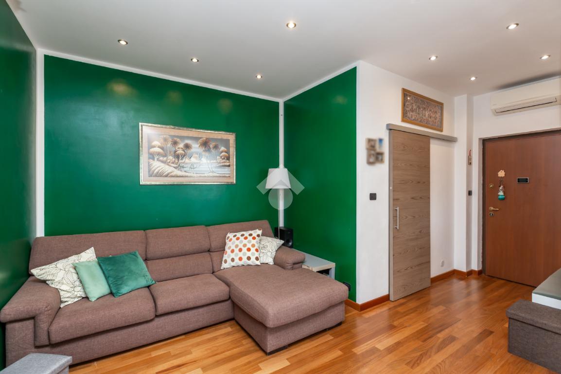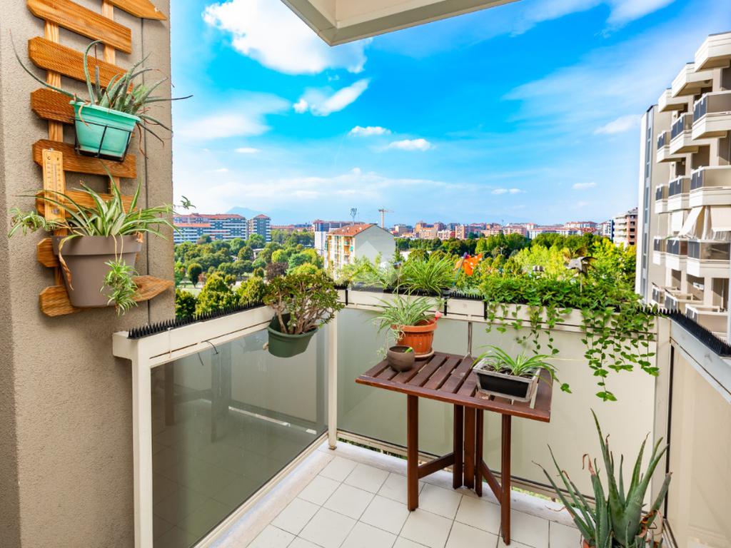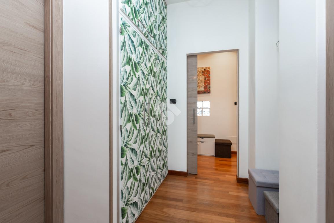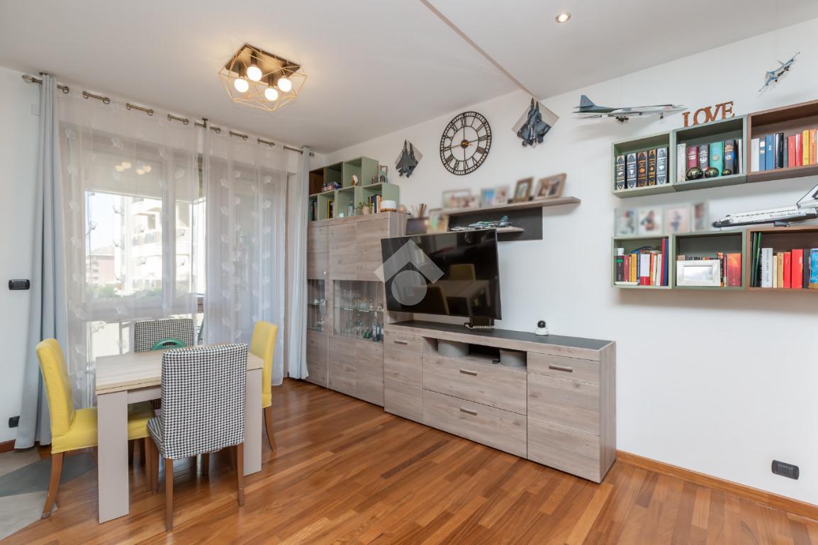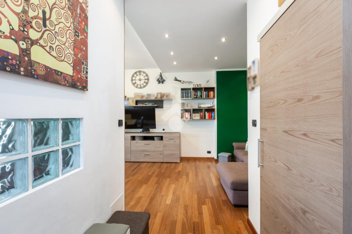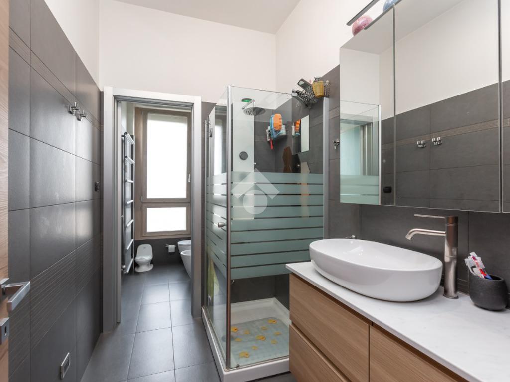 La scala dove si trova l’appartamento è dotata del doppio ascensore. L’immobile è sito all’ottavo piano ed internamente è stato ristrutturato circa cinque anni fa. Dal portoncino blindato accediamo direttamente sulla zona giorno composta dal soggiorno living con angolo cottura. La pavimentazione è in parquet, tranne per la zona cucina dove troviamo una piastrella esagonale con diverse tonalità di grigio. L’ambiente è munito di un climatizzatore ed ha una metratura di circa 35 mq che ci permettono di godere al meglio ogni singolo spazio e i momenti di relax in famiglia, ed ha l’affaccio sul cortile comune tramite un ampio balcone. Grazie al disimpegno, il quale divide le due zone, si accede alla zona notte dove troviamo le due camere, entrambe con parquet, quella matrimoniale con finestra e la seconda camera munita di balcone. Il bagno è diviso in due zone, dove nella prima troviamo il lavandino ed il box doccia, e al fondo i sanitari e l’angolo lavanderia ( lavatrice/asciugatrice ). Tutti gli infissi esterni sono in pvc con doppio vetro, muniti di zanzariere e tapparelle elettriche. Il sistema di riscaldamento nel condominio è il teleriscaldamento. Completa la proprietà un locale ad uso cantina sito al secondo piano interrato.
