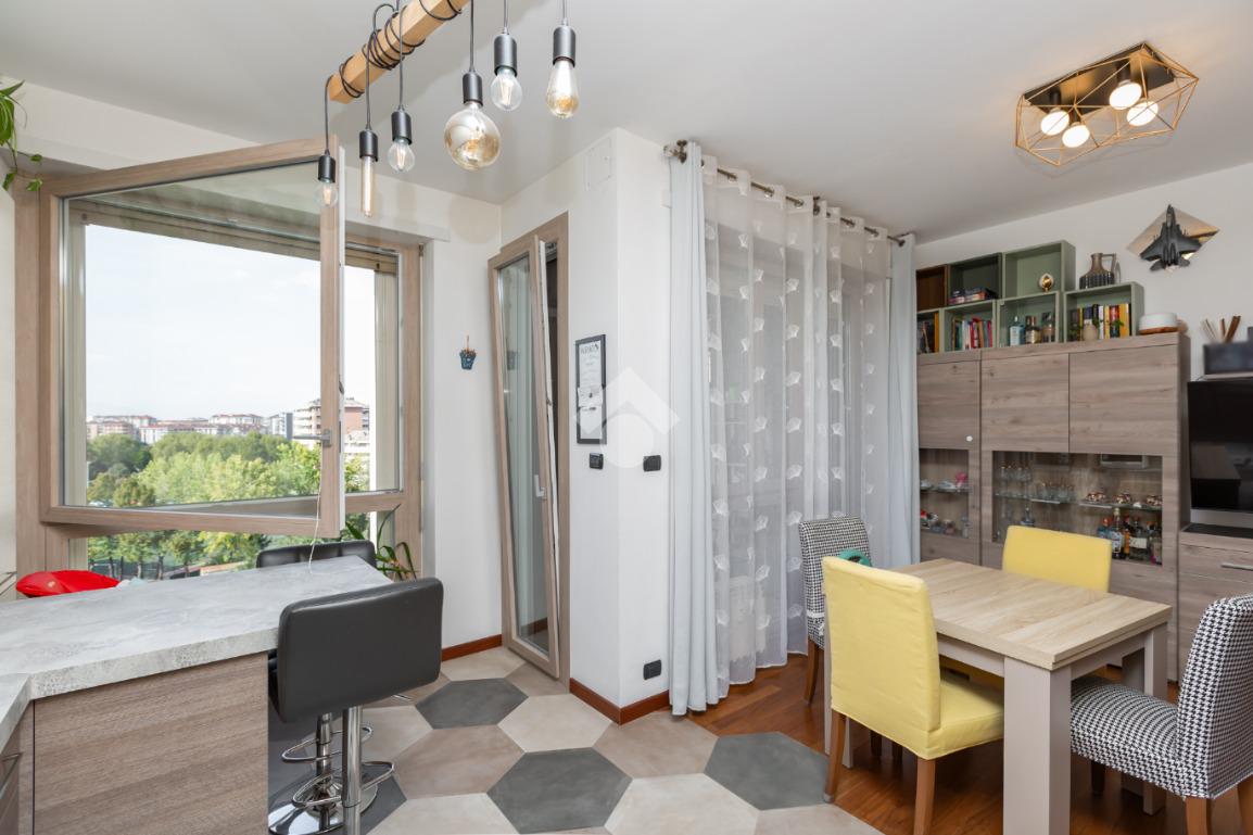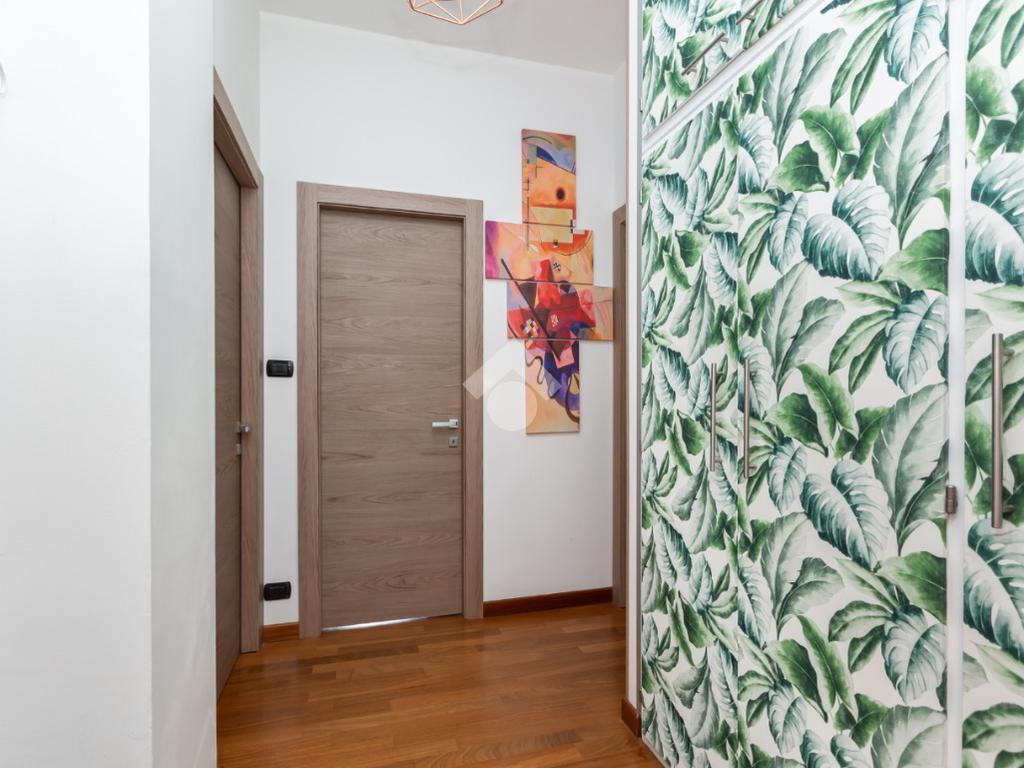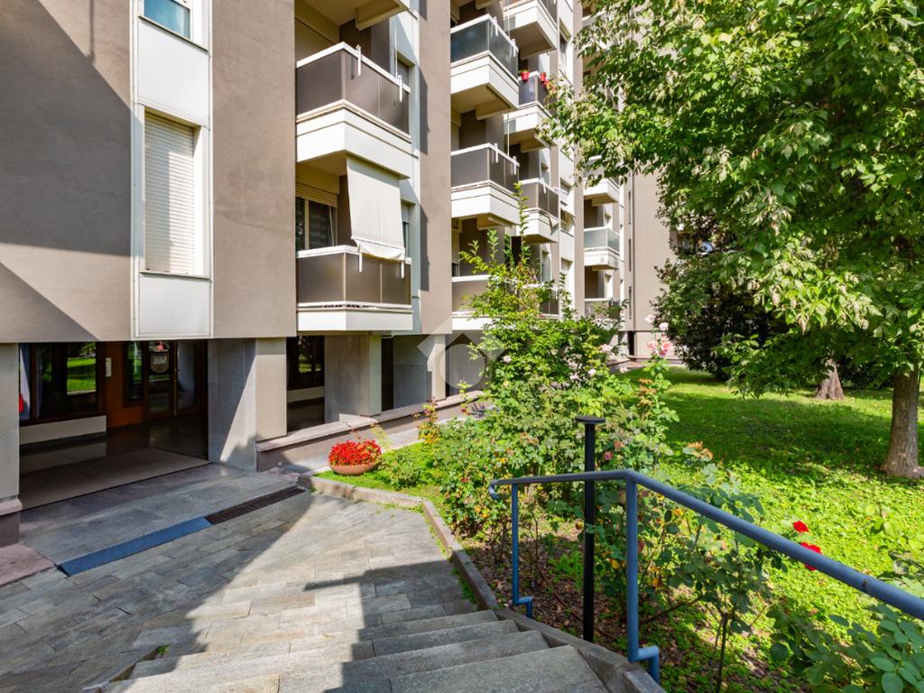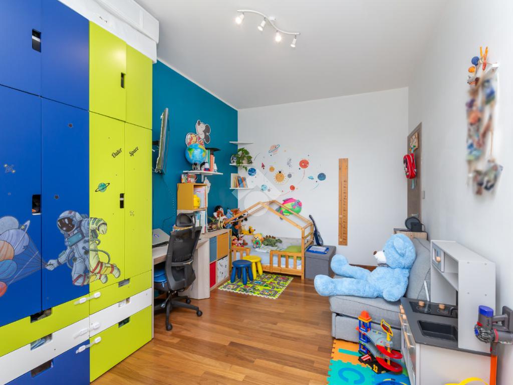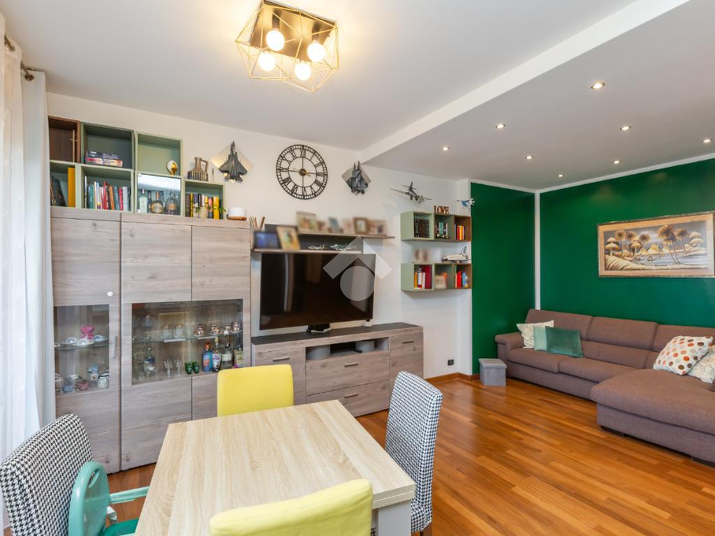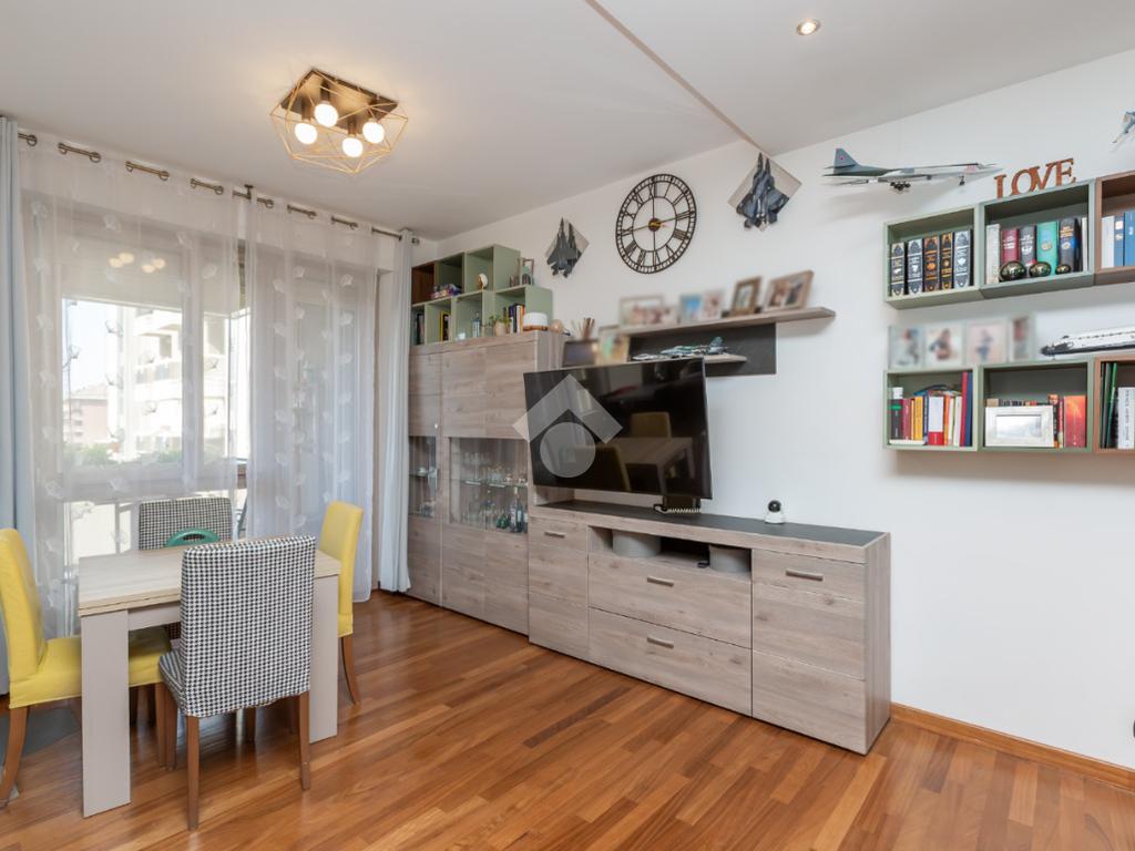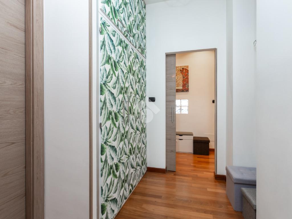 La scala dove si trova l’appartamento è dotata del doppio ascensore. L’immobile è sito all’ottavo piano ed internamente è stato ristrutturato circa cinque anni fa. Dal portoncino blindato accediamo direttamente sulla zona giorno composta dal soggiorno living con angolo cottura. La pavimentazione è in parquet, tranne per la zona cucina dove troviamo una piastrella esagonale con diverse tonalità di grigio. L’ambiente è munito di un climatizzatore ed ha una metratura di circa 35 mq che ci permettono di godere al meglio ogni singolo spazio e i momenti di relax in famiglia, ed ha l’affaccio sul cortile comune tramite un ampio balcone. Grazie al disimpegno, il quale divide le due zone, si accede alla zona notte dove troviamo le due camere, entrambe con parquet, quella matrimoniale con finestra e la seconda camera munita di balcone. Il bagno è diviso in due zone, dove nella prima troviamo il lavandino ed il box doccia, e al fondo i sanitari e l’angolo lavanderia ( lavatrice/asciugatrice ). Tutti gli infissi esterni sono in pvc con doppio vetro, muniti di zanzariere e tapparelle elettriche. Il sistema di riscaldamento nel condominio è il teleriscaldamento. Completa la proprietà un locale ad uso cantina sito al secondo piano interrato.