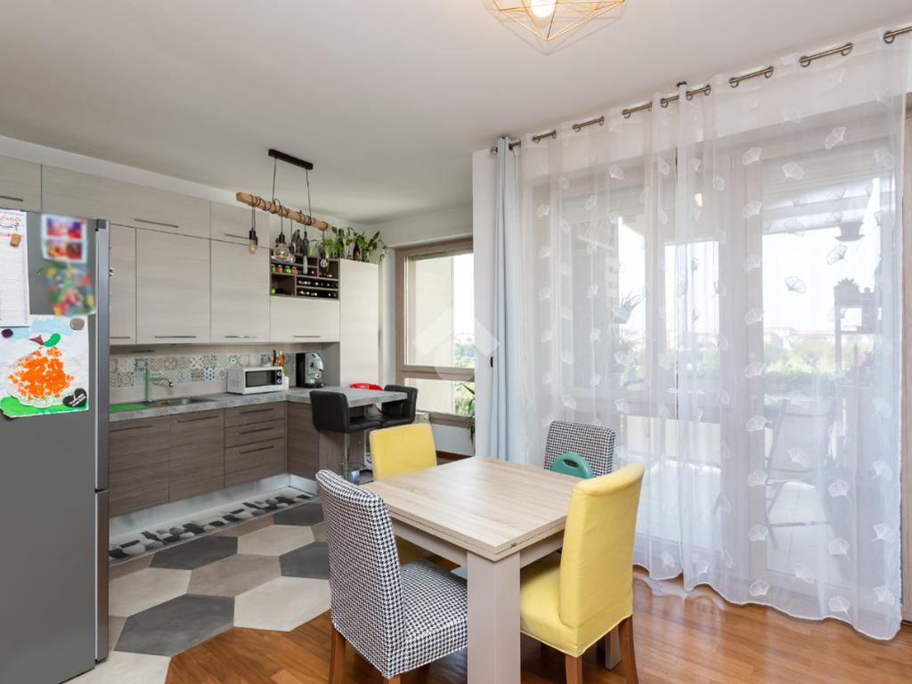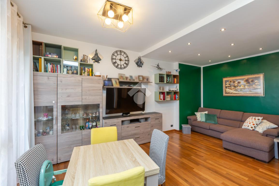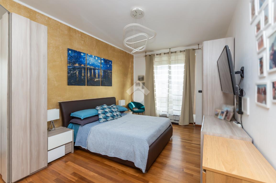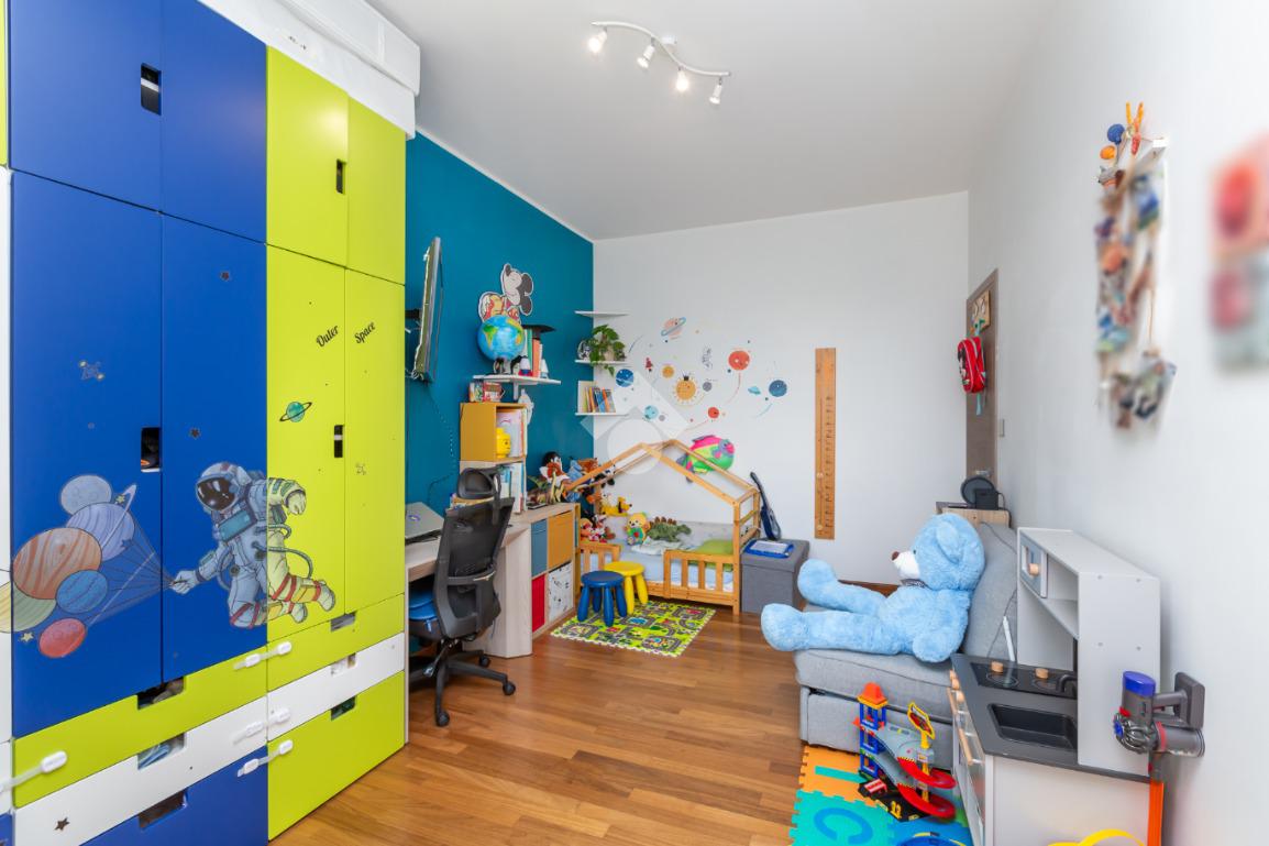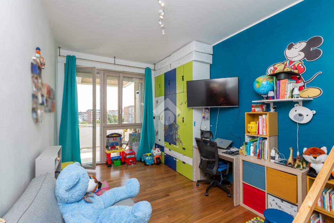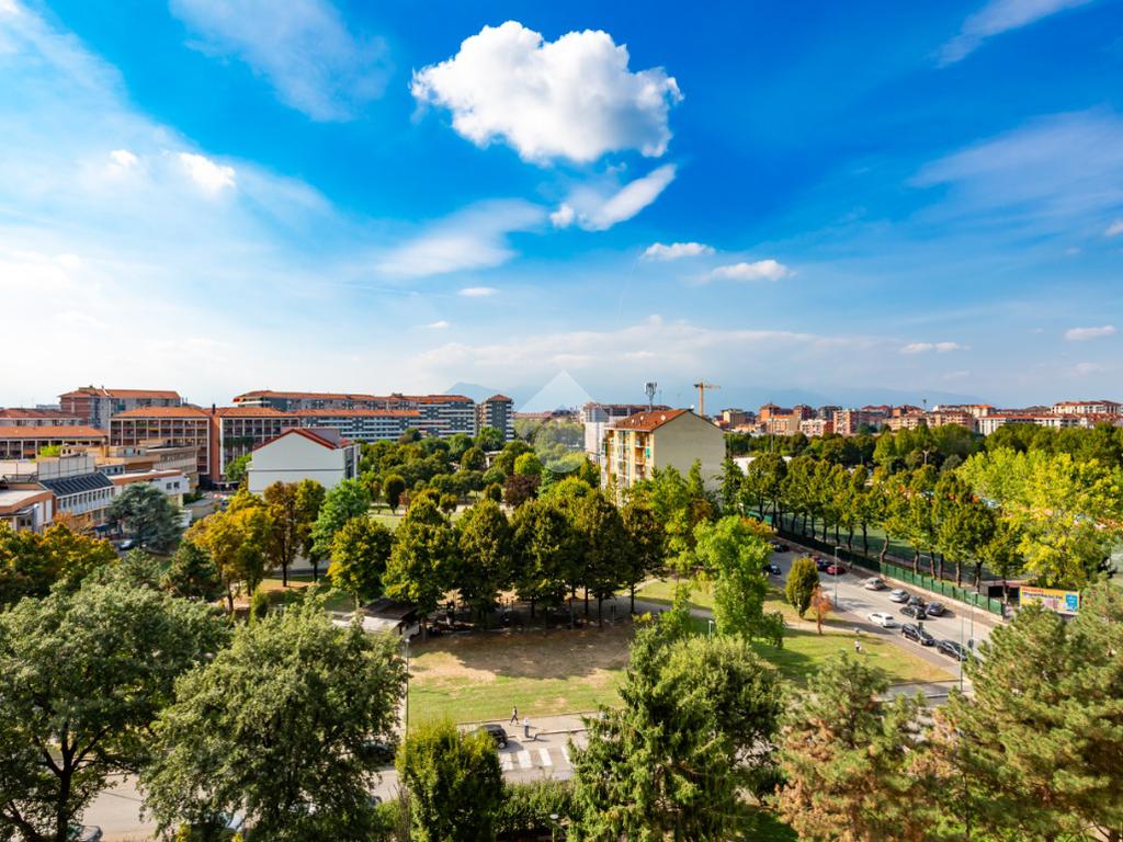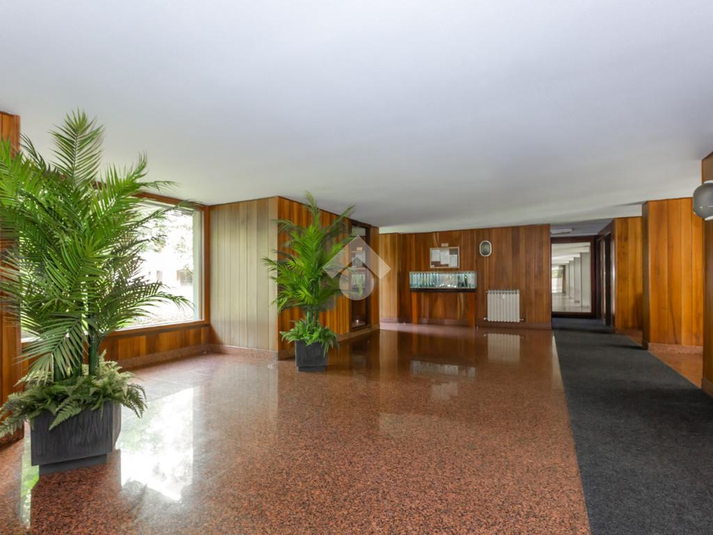 La scala dove si trova l’appartamento è dotata del doppio ascensore. L’immobile è sito all’ottavo piano ed internamente è stato ristrutturato circa cinque anni fa. Dal portoncino blindato accediamo direttamente sulla zona giorno composta dal soggiorno living con angolo cottura. La pavimentazione è in parquet, tranne per la zona cucina dove troviamo una piastrella esagonale con diverse tonalità di grigio. L’ambiente è munito di un climatizzatore ed ha una metratura di circa 35 mq che ci permettono di godere al meglio ogni singolo spazio e i momenti di relax in famiglia, ed ha l’affaccio sul cortile comune tramite un ampio balcone. Grazie al disimpegno, il quale divide le due zone, si accede alla zona notte dove troviamo le due camere, entrambe con parquet, quella matrimoniale con finestra e la seconda camera munita di balcone. Il bagno è diviso in due zone, dove nella prima troviamo il lavandino ed il box doccia, e al fondo i sanitari e l’angolo lavanderia ( lavatrice/asciugatrice ). Tutti gli infissi esterni sono in pvc con doppio vetro, muniti di zanzariere e tapparelle elettriche. Il sistema di riscaldamento nel condominio è il teleriscaldamento. Completa la proprietà un locale ad uso cantina sito al secondo piano interrato.