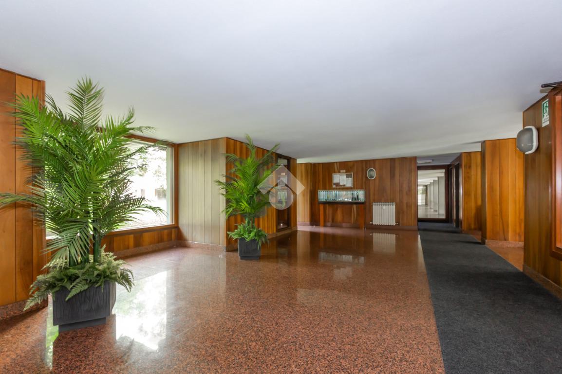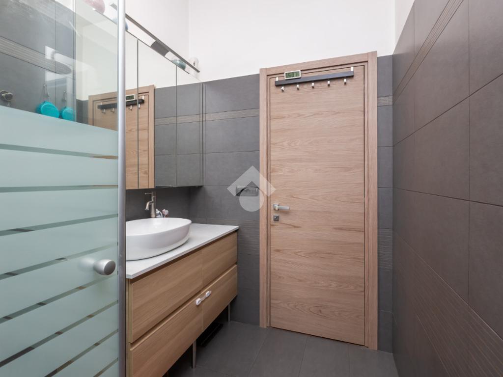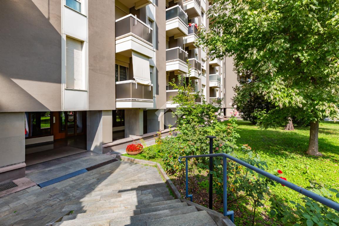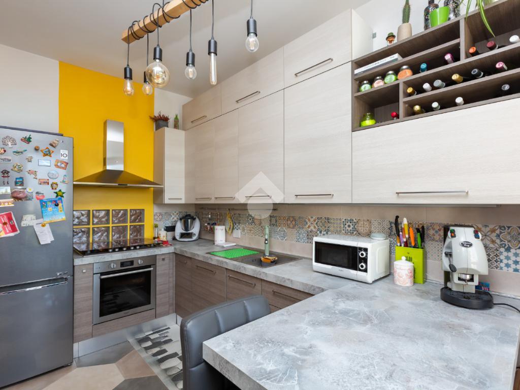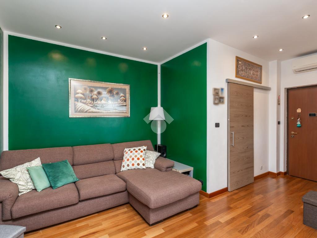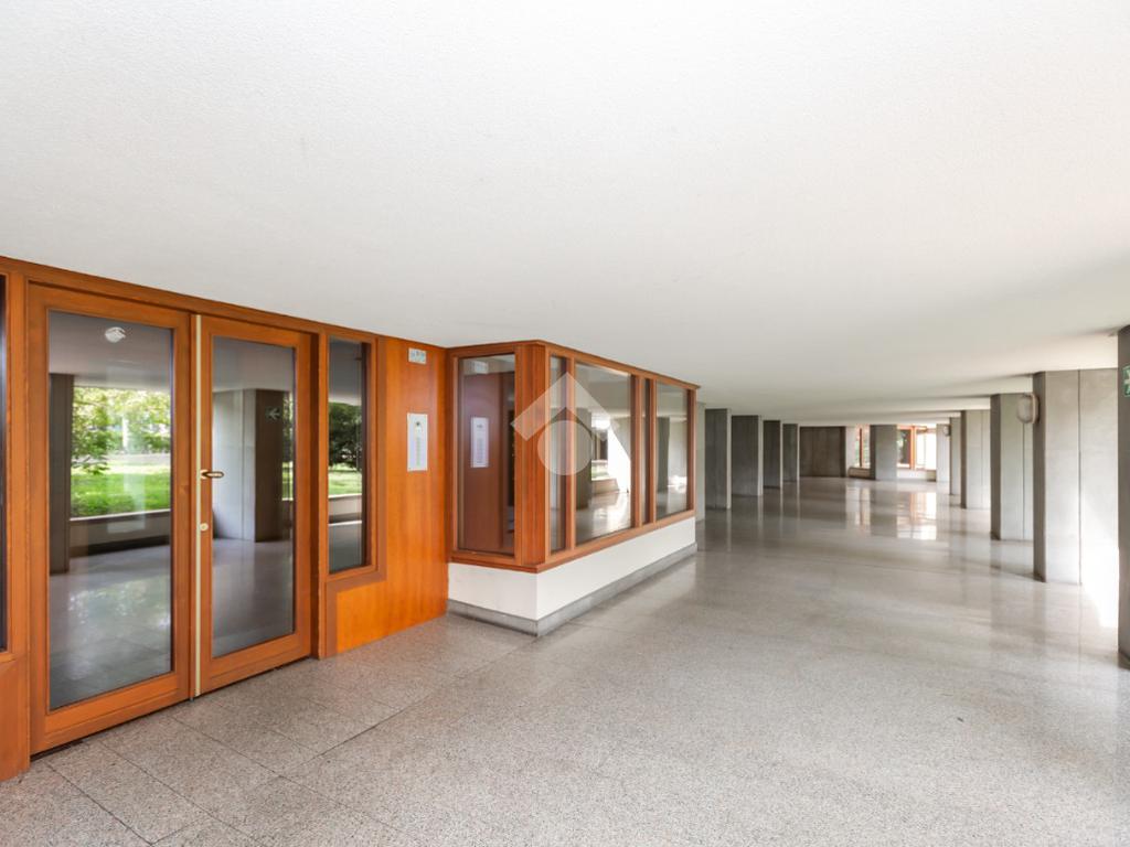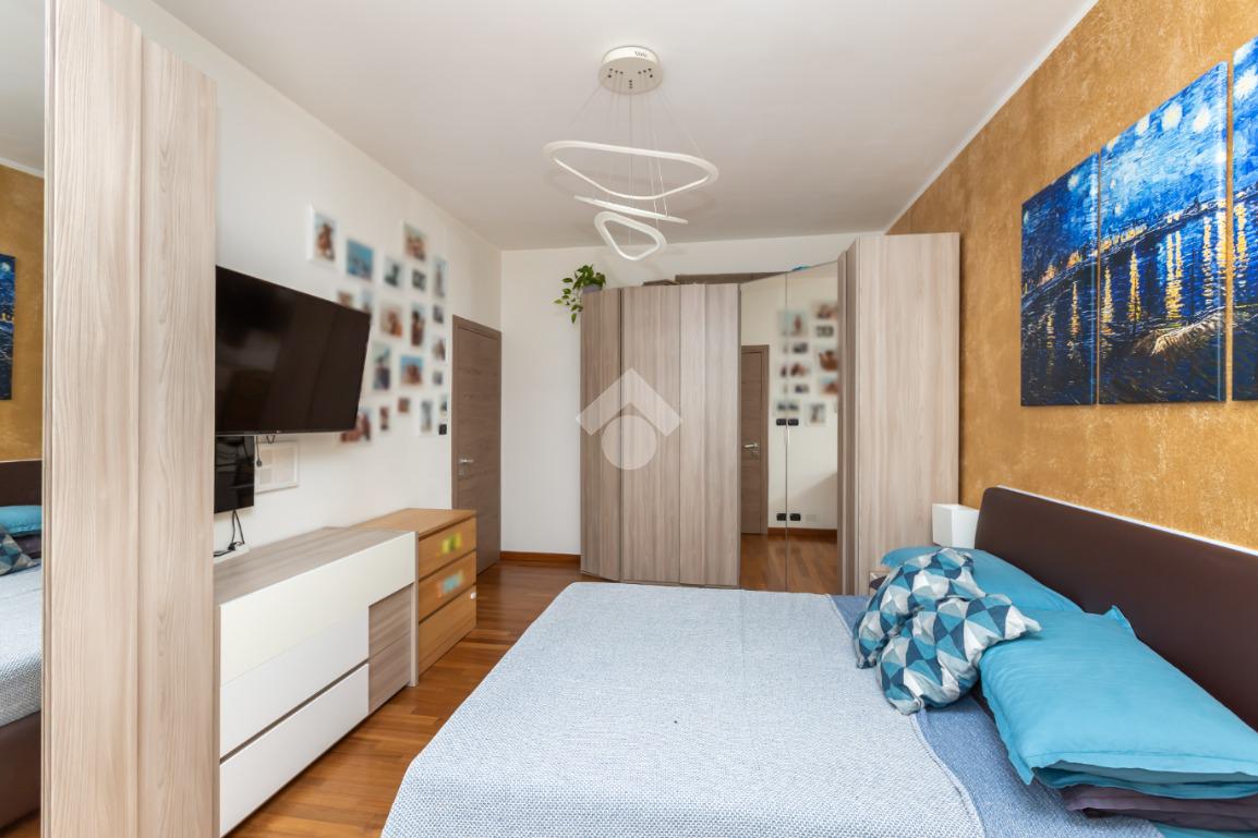 La scala dove si trova l’appartamento è dotata del doppio ascensore. L’immobile è sito all’ottavo piano ed internamente è stato ristrutturato circa cinque anni fa. Dal portoncino blindato accediamo direttamente sulla zona giorno composta dal soggiorno living con angolo cottura. La pavimentazione è in parquet, tranne per la zona cucina dove troviamo una piastrella esagonale con diverse tonalità di grigio. L’ambiente è munito di un climatizzatore ed ha una metratura di circa 35 mq che ci permettono di godere al meglio ogni singolo spazio e i momenti di relax in famiglia, ed ha l’affaccio sul cortile comune tramite un ampio balcone. Grazie al disimpegno, il quale divide le due zone, si accede alla zona notte dove troviamo le due camere, entrambe con parquet, quella matrimoniale con finestra e la seconda camera munita di balcone. Il bagno è diviso in due zone, dove nella prima troviamo il lavandino ed il box doccia, e al fondo i sanitari e l’angolo lavanderia ( lavatrice/asciugatrice ). Tutti gli infissi esterni sono in pvc con doppio vetro, muniti di zanzariere e tapparelle elettriche. Il sistema di riscaldamento nel condominio è il teleriscaldamento. Completa la proprietà un locale ad uso cantina sito al secondo piano interrato.