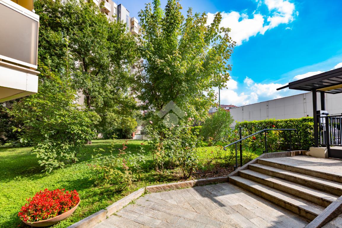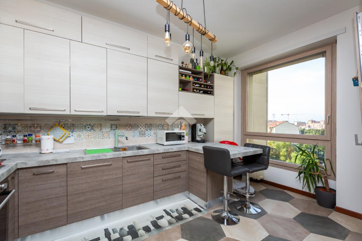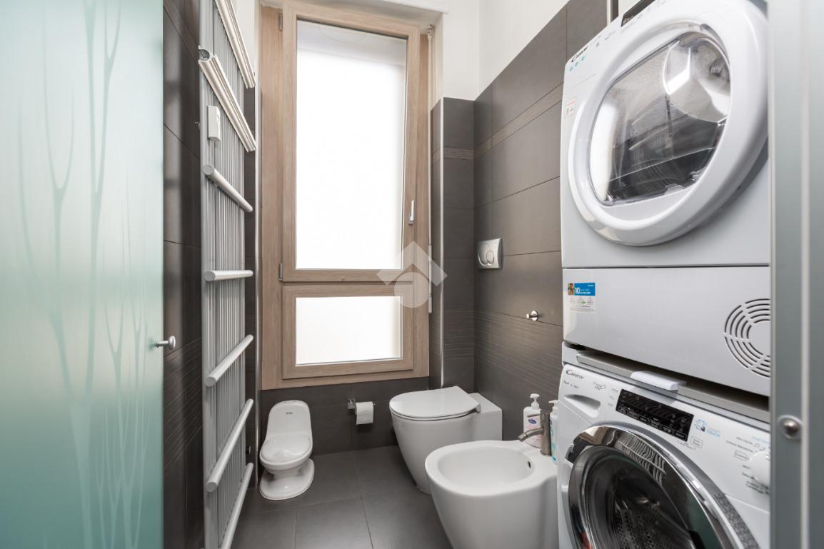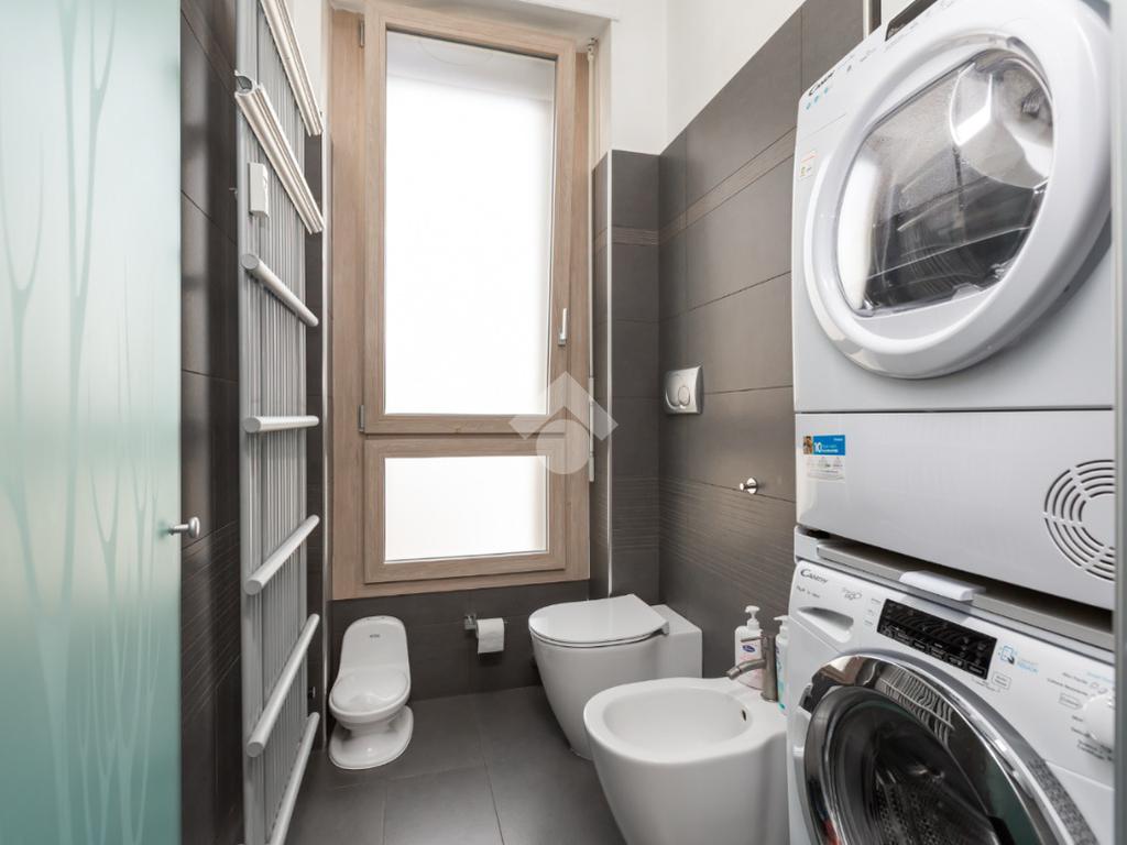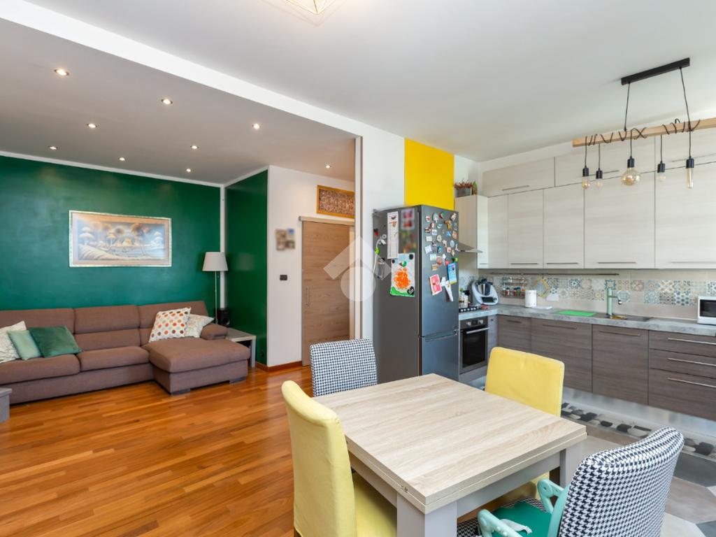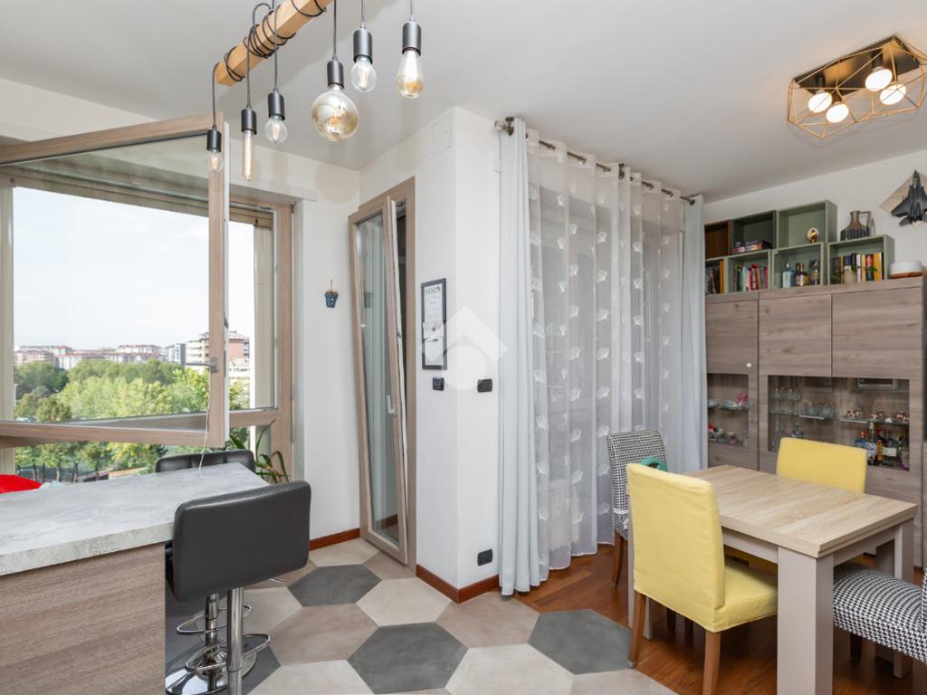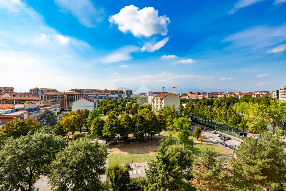 La scala dove si trova l’appartamento è dotata del doppio ascensore. L’immobile è sito all’ottavo piano ed internamente è stato ristrutturato circa cinque anni fa. Dal portoncino blindato accediamo direttamente sulla zona giorno composta dal soggiorno living con angolo cottura. La pavimentazione è in parquet, tranne per la zona cucina dove troviamo una piastrella esagonale con diverse tonalità di grigio. L’ambiente è munito di un climatizzatore ed ha una metratura di circa 35 mq che ci permettono di godere al meglio ogni singolo spazio e i momenti di relax in famiglia, ed ha l’affaccio sul cortile comune tramite un ampio balcone. Grazie al disimpegno, il quale divide le due zone, si accede alla zona notte dove troviamo le due camere, entrambe con parquet, quella matrimoniale con finestra e la seconda camera munita di balcone. Il bagno è diviso in due zone, dove nella prima troviamo il lavandino ed il box doccia, e al fondo i sanitari e l’angolo lavanderia ( lavatrice/asciugatrice ). Tutti gli infissi esterni sono in pvc con doppio vetro, muniti di zanzariere e tapparelle elettriche. Il sistema di riscaldamento nel condominio è il teleriscaldamento. Completa la proprietà un locale ad uso cantina sito al secondo piano interrato.