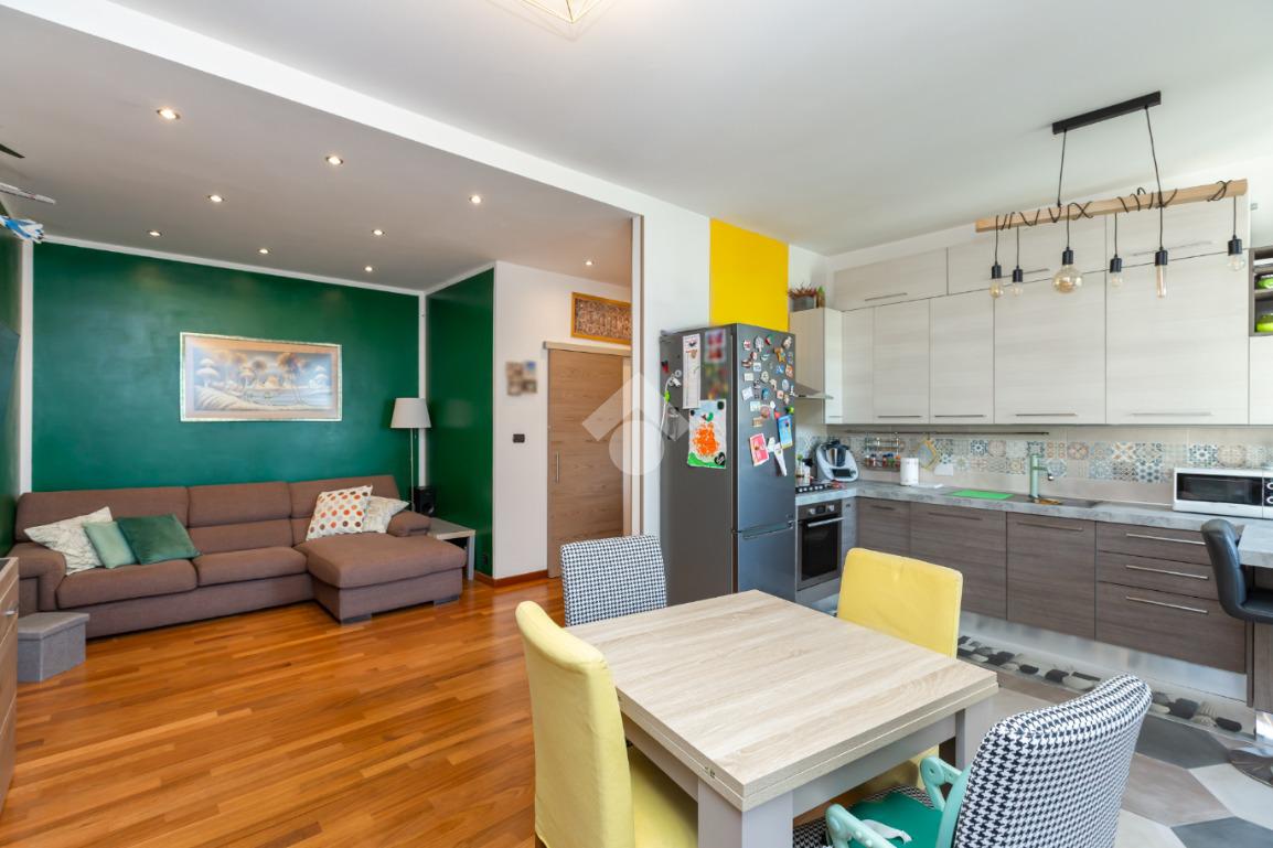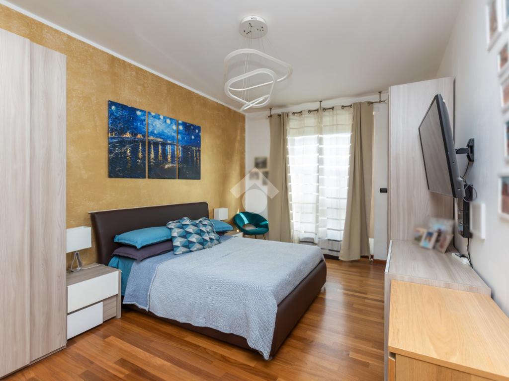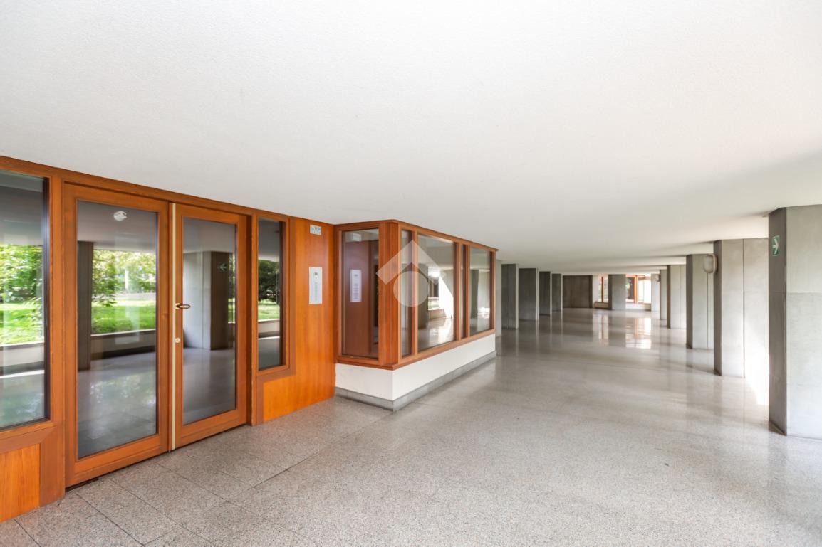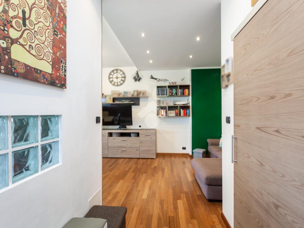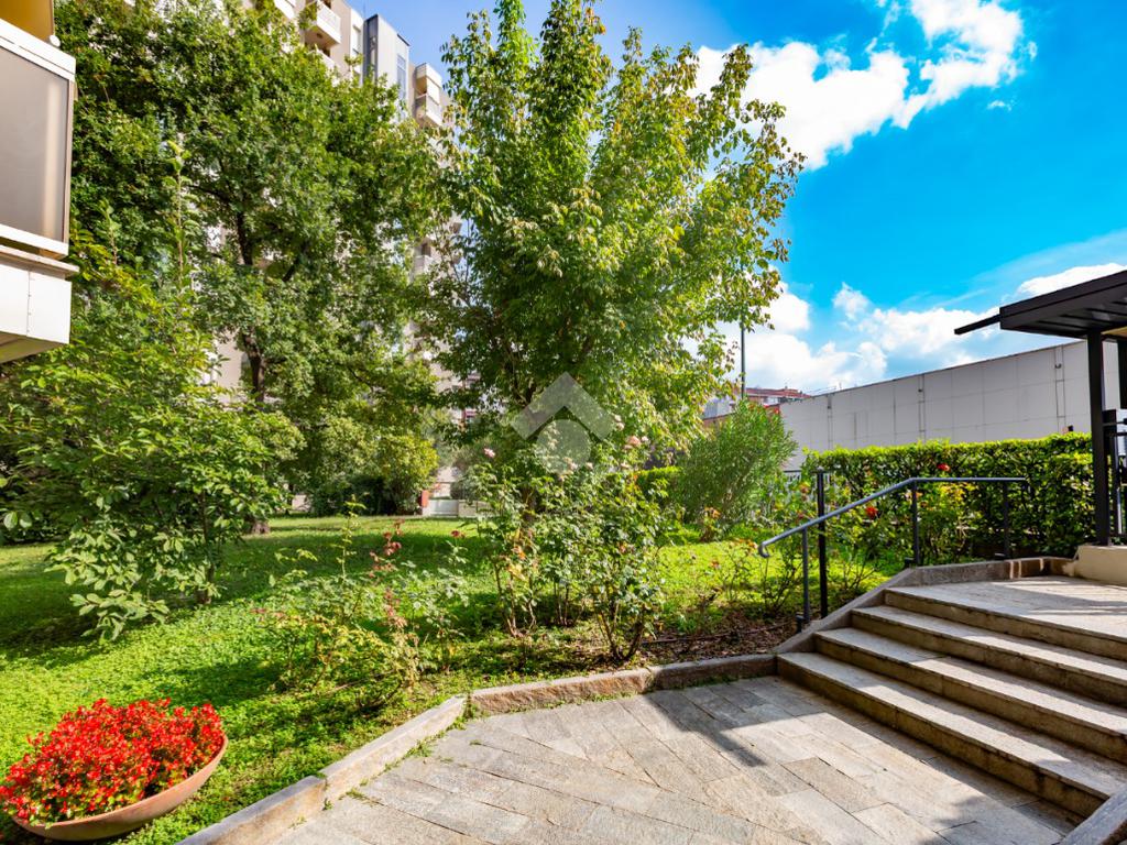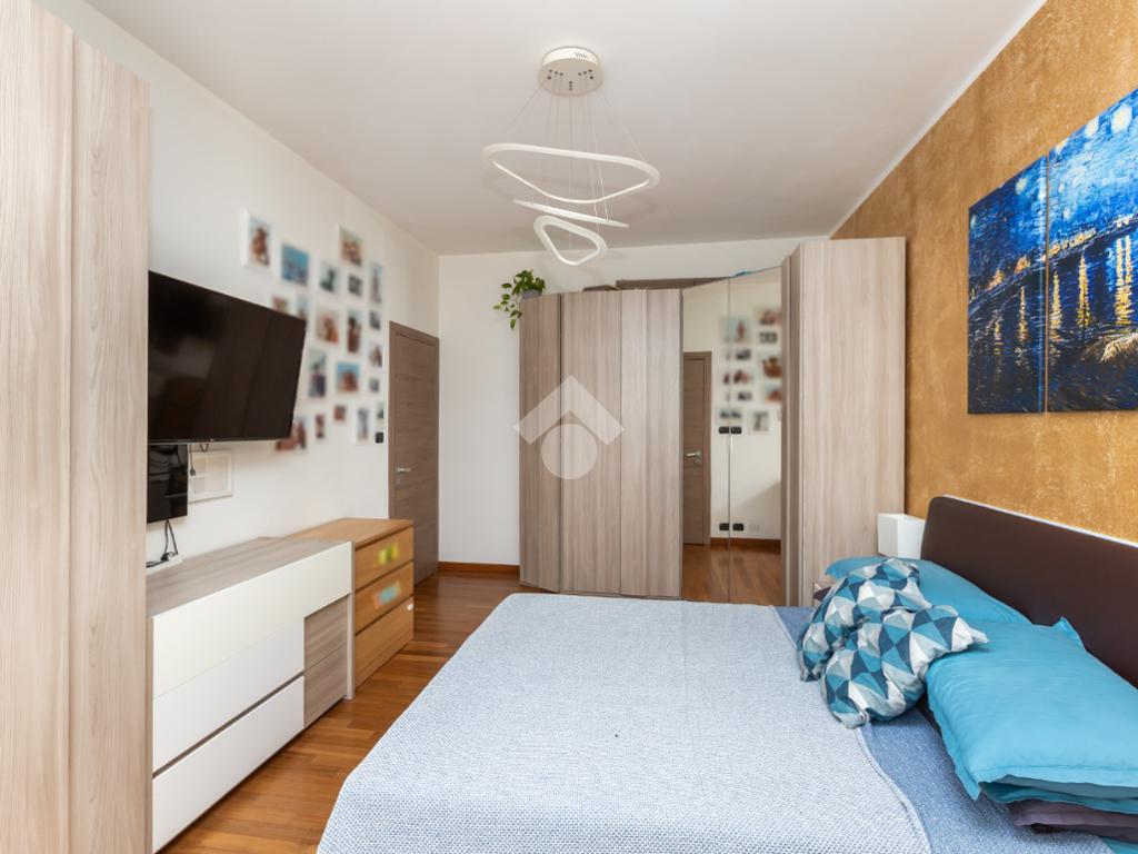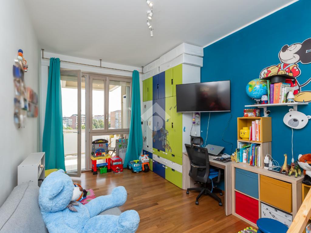 La scala dove si trova l’appartamento è dotata del doppio ascensore. L’immobile è sito all’ottavo piano ed internamente è stato ristrutturato circa cinque anni fa. Dal portoncino blindato accediamo direttamente sulla zona giorno composta dal soggiorno living con angolo cottura. La pavimentazione è in parquet, tranne per la zona cucina dove troviamo una piastrella esagonale con diverse tonalità di grigio. L’ambiente è munito di un climatizzatore ed ha una metratura di circa 35 mq che ci permettono di godere al meglio ogni singolo spazio e i momenti di relax in famiglia, ed ha l’affaccio sul cortile comune tramite un ampio balcone. Grazie al disimpegno, il quale divide le due zone, si accede alla zona notte dove troviamo le due camere, entrambe con parquet, quella matrimoniale con finestra e la seconda camera munita di balcone. Il bagno è diviso in due zone, dove nella prima troviamo il lavandino ed il box doccia, e al fondo i sanitari e l’angolo lavanderia ( lavatrice/asciugatrice ). Tutti gli infissi esterni sono in pvc con doppio vetro, muniti di zanzariere e tapparelle elettriche. Il sistema di riscaldamento nel condominio è il teleriscaldamento. Completa la proprietà un locale ad uso cantina sito al secondo piano interrato.