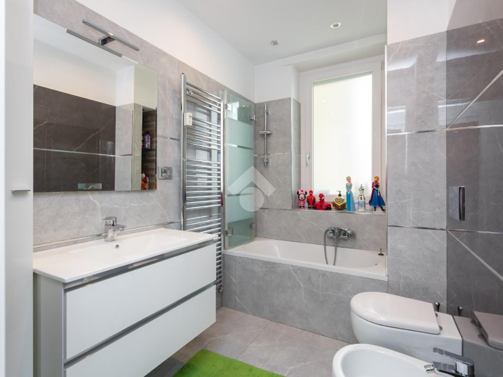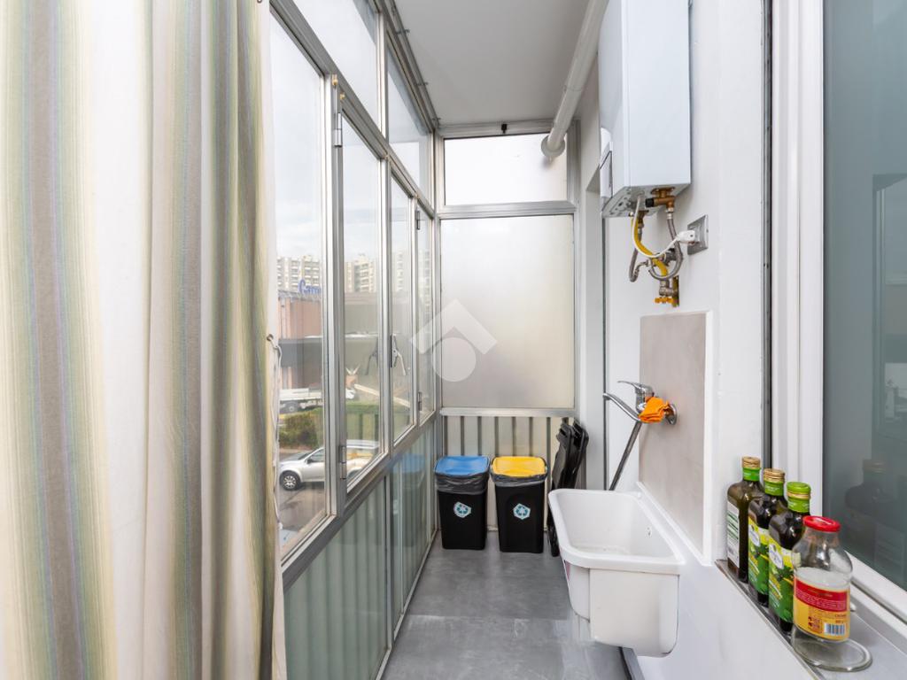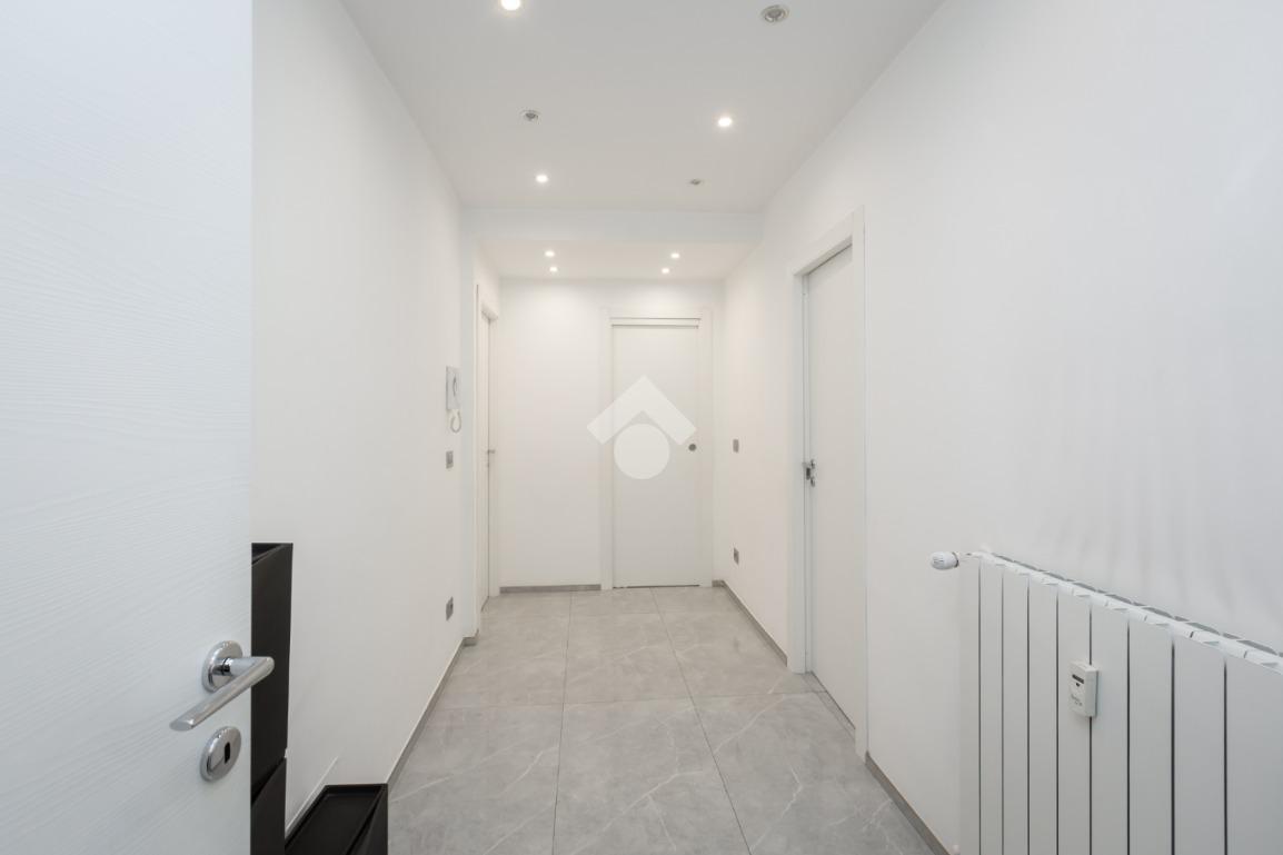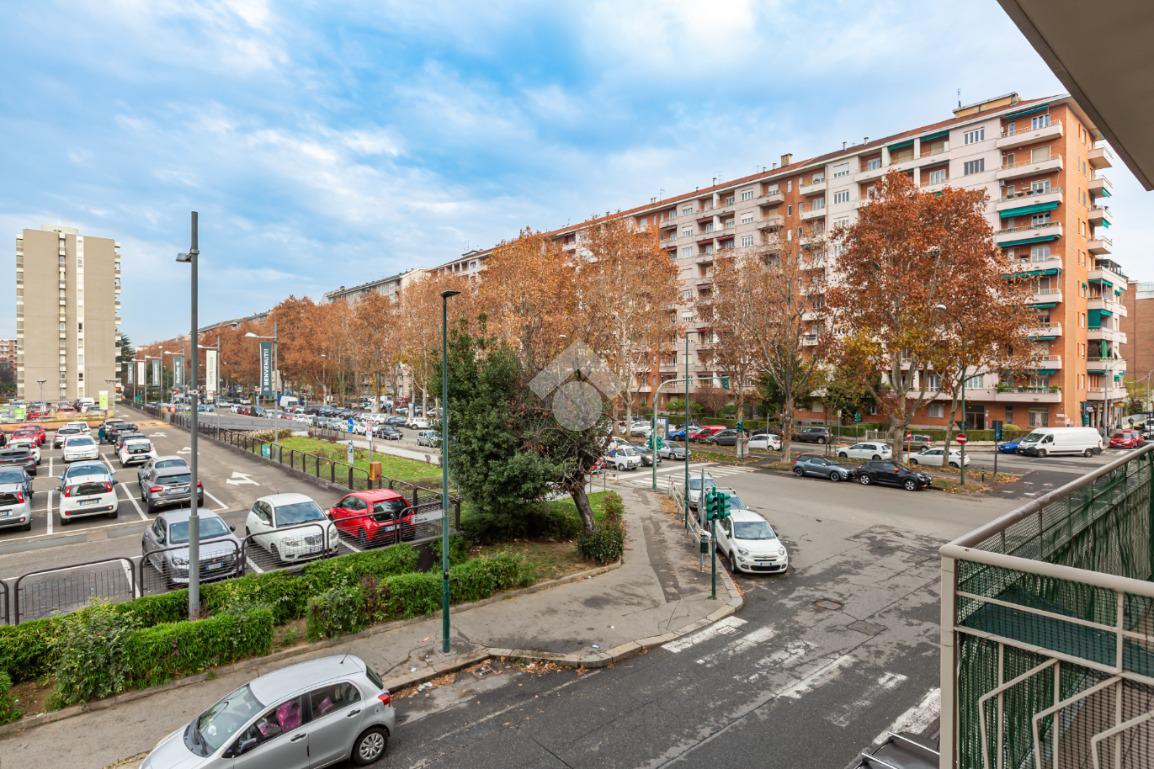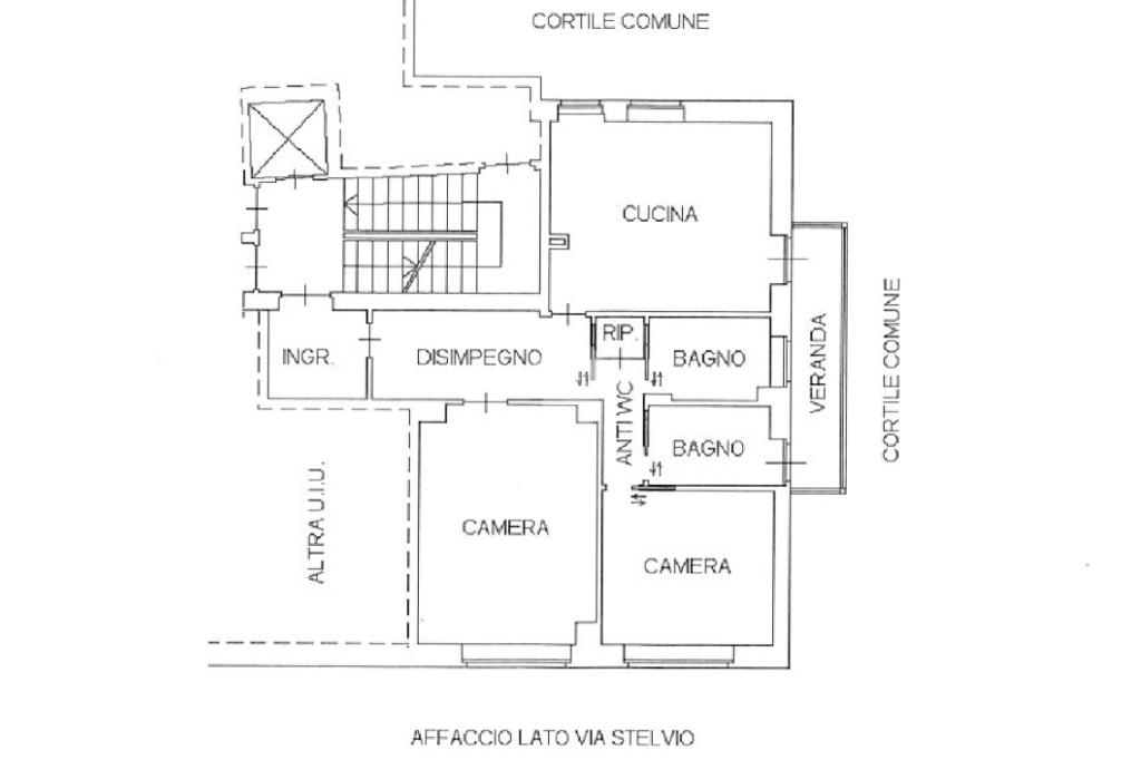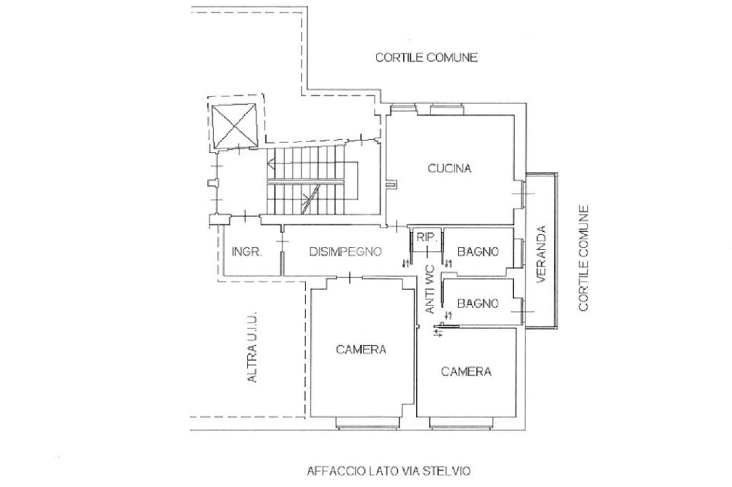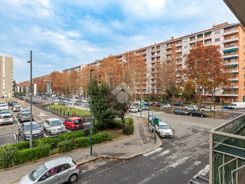L’appartamento è al primo piano, raggiungibile tramite ascensore, in un complesso decoroso rientrato dalla strada grazie al giardino condominiale. L'immobile gode di una tripla esposizione. Internamente è stato completamente e finemente ristrutturato e si sviluppa su una metratura generosa, caratteristica che rende vivibile al meglio ogni singolo vano. L'accesso avviene tramite un portoncino blindato che si affaccia sull’ingresso il quale ci accompagna su ampio disimpegno che divide in modo ottimale tutti i vani dell'immobile. La zona giorno è un ambiente ampio e confortevole. Date le dimensioni ci permette di avere una cucina lineare, con un tavolo quadrato centrato rispetto alla stanza, ed una parete dedicata alla tv con difronte un comodo divano. L’affaccio è lato cortile, grazie alle finestre e all’accesso ad un ampio balcone verandato. Le camere da letto sono due, entrambe dotate di tutti i comfort e con affaccio su via Stelvio fronte Carrefour. L’appartamento ha i doppi servizi. Il primo con vasca e finestra. Il secondo con doccia e porta finestra che dà sul balcone interno. Adiacente al primo servizio troviamo un ripostiglio attualmente utilizzato come lavanderia. Cucina e camere sono munite di climatizzatore. Tutti gli infissi esterni sono in pvc e le tapparelle elettriche. La proprietà dispone di una cantina al piano interrato. Il teleriscaldamento è il sistema di riscaldamento presente nel condominio.